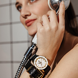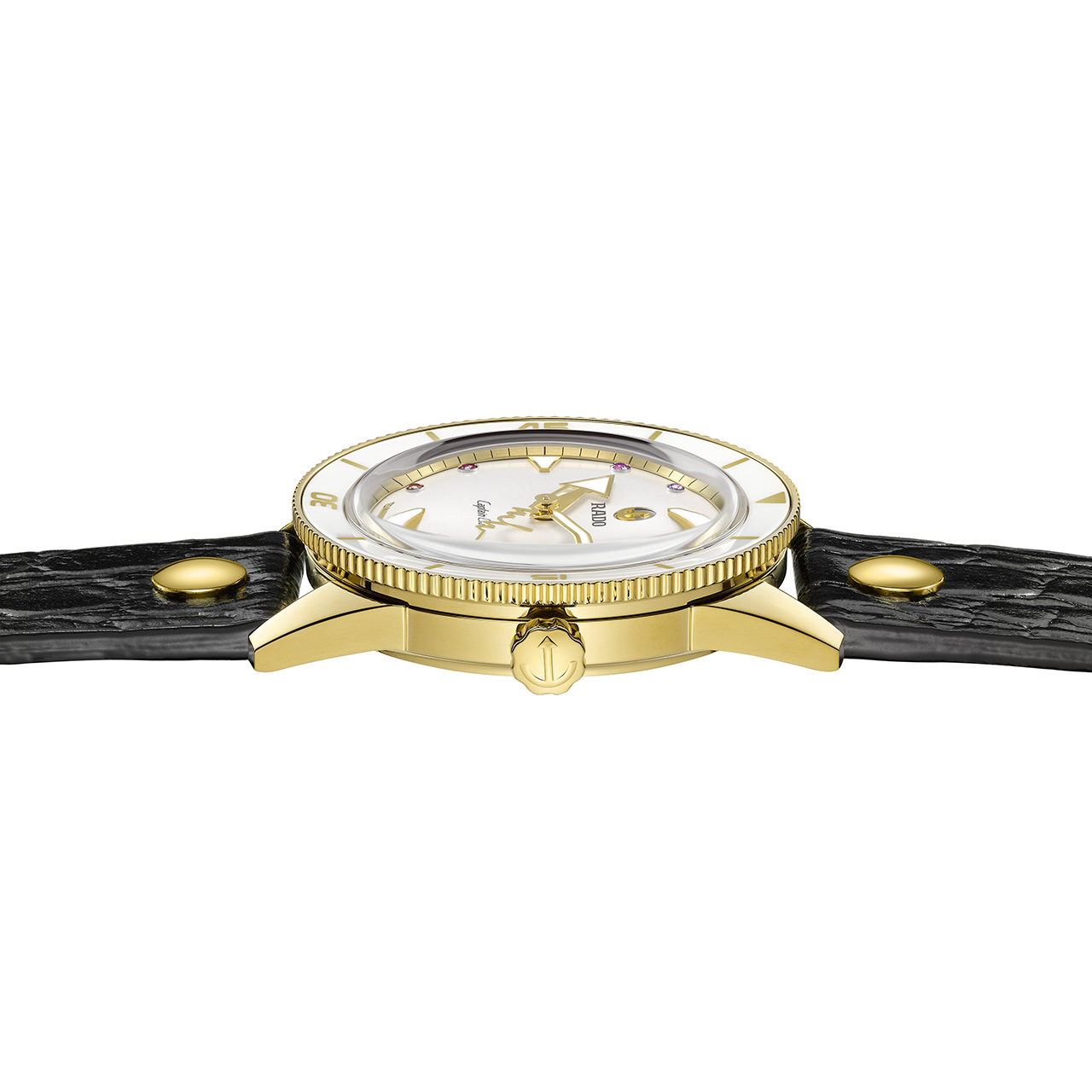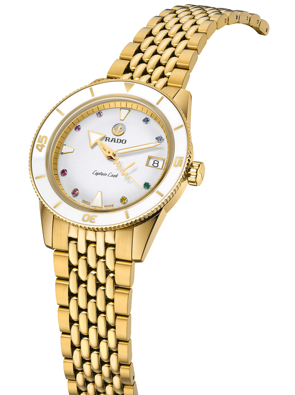 Новый Rado Captain Cook «сердцебиение Марины Хоерманседер» – это приглашение отпраздновать все то, что любят в берлинском районе Кройцберг, и уникальность во всем. Новые часы украшены красочной радугой из восьми драгоценных камней и нанесенными на яркий и выразительный циферблат индексами, поверхность которого перекликается с белой высокотехнологичной керамической вставкой во вращающемся безеле. Золотистые металлизированные метки и цифры и с лазерной гравировкой идеально сочетаются с полированным PVD-покрытием желто-золотого цвета корпуса и безеля из нержавеющей стали. Циферблат и символ золотого движущегося якоря с серебристой задней панелью, темно-серые логотипы Rado и Captain Cook защищены изысканным сапфировым стеклом в форме коробки, хорошо известным любителям продукции Captain Cook. Кристалл имеет прозрачное покрытие на обеих гранях, а на часовую и минутную стрелки нанесено белое покрытие Super-LumiNova® для максимальной читаемости.