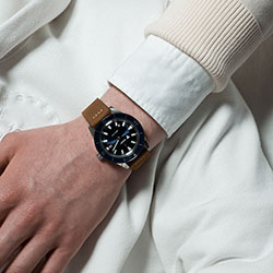 - Вращающийся безель из нержавеющей стали со вставкой из полированной высокотехнологичной керамики черного цвета, на которой выгравированы металлизированные цифры, деления и метки.