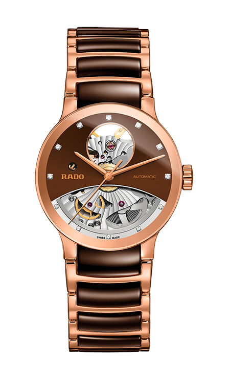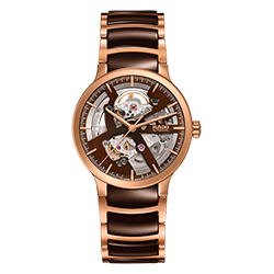 4. Rado Centrix Automatic Open Heart Gent 01.734.0179.3.030 Корпус из нержавеющей полированной стали. Скелетонированный циферблат шоколадно-коричневого цвета с покрытыми родием центральными стрелками и условными накладными часовыми индексами. Задняя крышка корпуса из прозрачного сапфира. Браслет из нержавеющей полированной стали с шоколадно-коричневыми полированными промежуточными звеньями из высокотехнологичной керамики и раскладывающейся титановой застёжкой. |