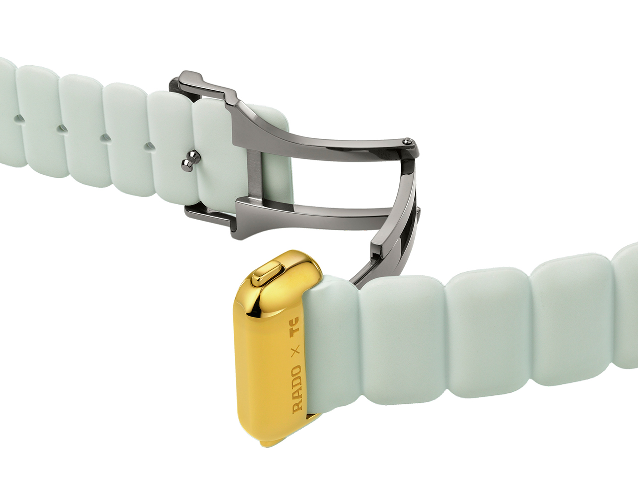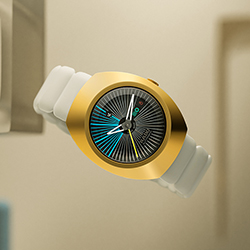 Корпус выполнен из фирменного материала Ceramos, а безель с PVD-покрытием жёлтого золота подчёркивает скульптурные линии. Матовый чёрный циферблат дополнен серебристо-синей минутной шкалой и оригинальным шрифтом Tej Chauhan для индикации дня недели и даты. Светло-серый каучуковый ремешок в форме «подушки» усиливает контраст и делает образ по-настоящему дизайнерским.