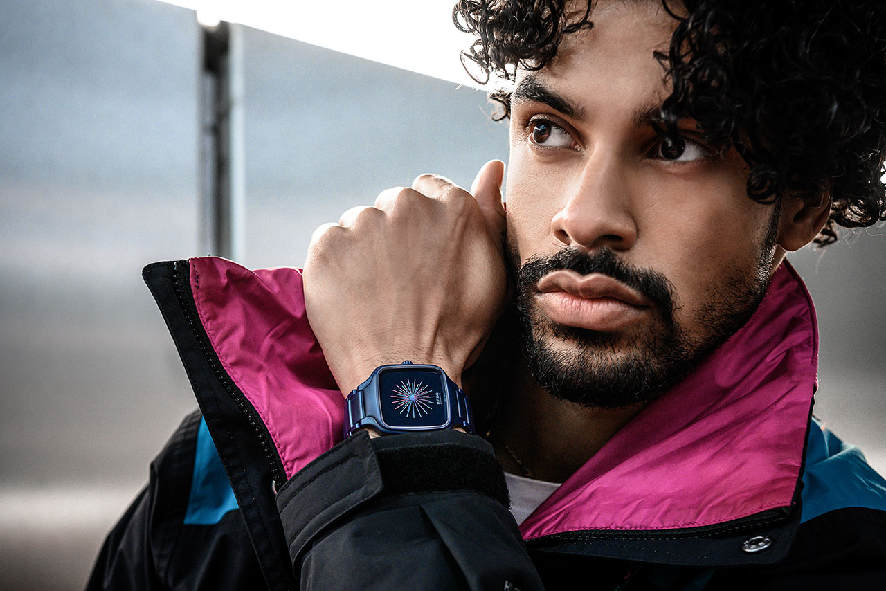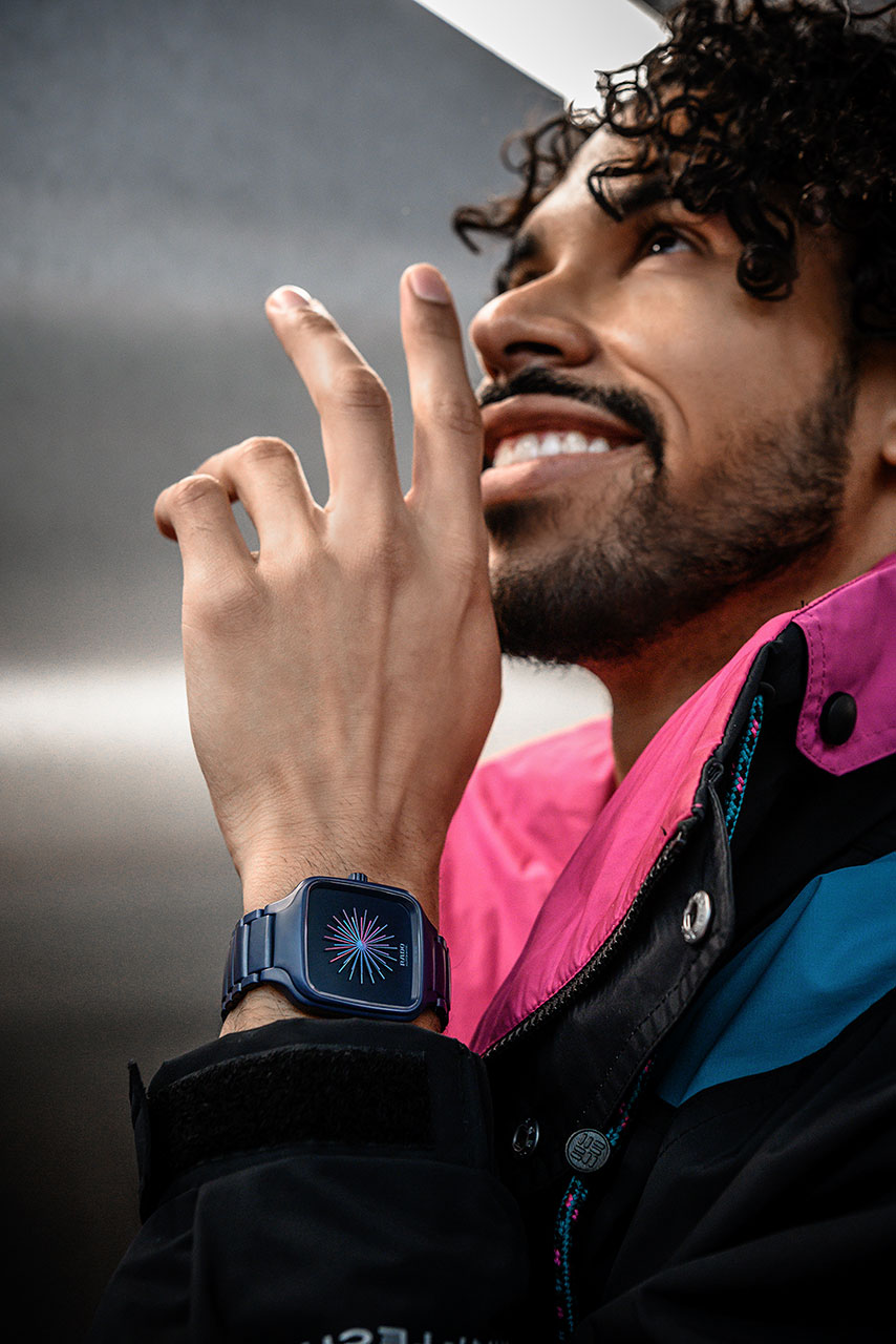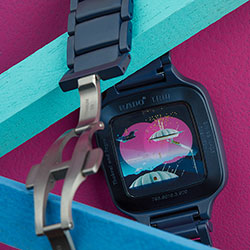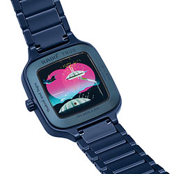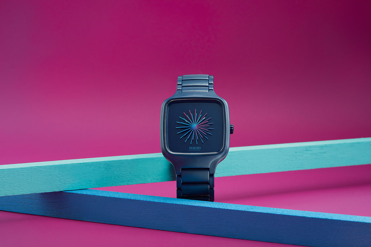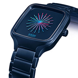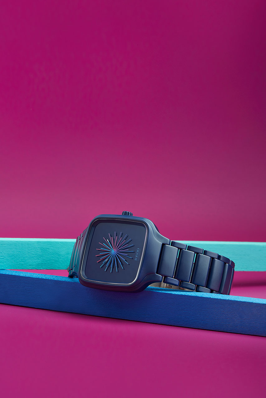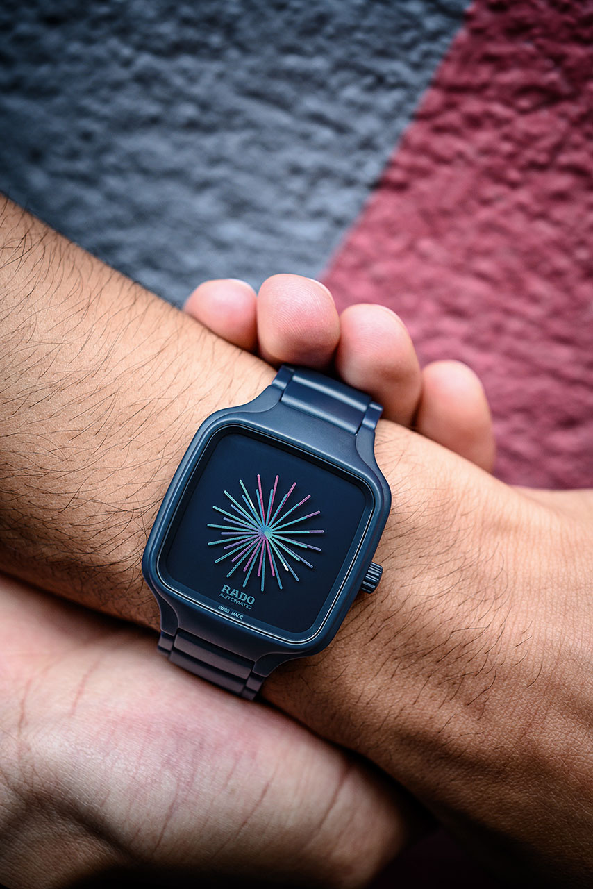 Циферблат с цветными акцентами облачен в квадратный корпус из матовой высокотехнологичной керамики синего цвета диаметром 38 мм — культовые дизайн и форма Rado родом из 70-х, обновленные в духе ХХІ века. Задняя крышка корпуса украшена рисунком под названием Dominus Aeries, созданным дуэтом, который сочетает в себе взгляд на будущее и воспоминания из прошлого. Поэтому верхняя и задняя часть часов являются прекрасными произведениями искусства в исполнении Thukral and Tagra.