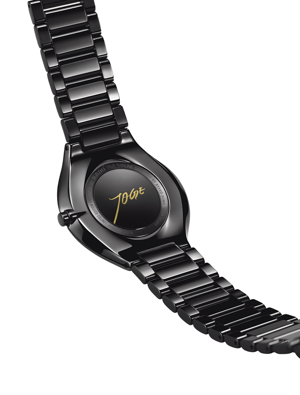 Часы True Thinline Toge из полированной высокотехнологичной керамики черного цвета выпущены лимитированной серией в 1001 экземпляр с особой гравировкой на задней части корпуса — надписью «Toge», выполненной рукой Аяко.
