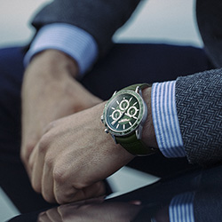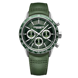 Пожалуй, одной из самых привлекательных моделей новой коллекции является модель 7741-SC7-52021, представленная в завораживающем зеленом цвете. У этой модели 30-минутный и 12-часовой окошки хронографа оснащены хорошо читаемыми белыми стрелками, а все три счетчика обрамлены серебристыми кругами. Часть циферблата с часовыми метками выполнена в виде улитки – это придает дисплею восхитительную текстуру. А уникальный цвет циферблата добавляет модели привлекательности.