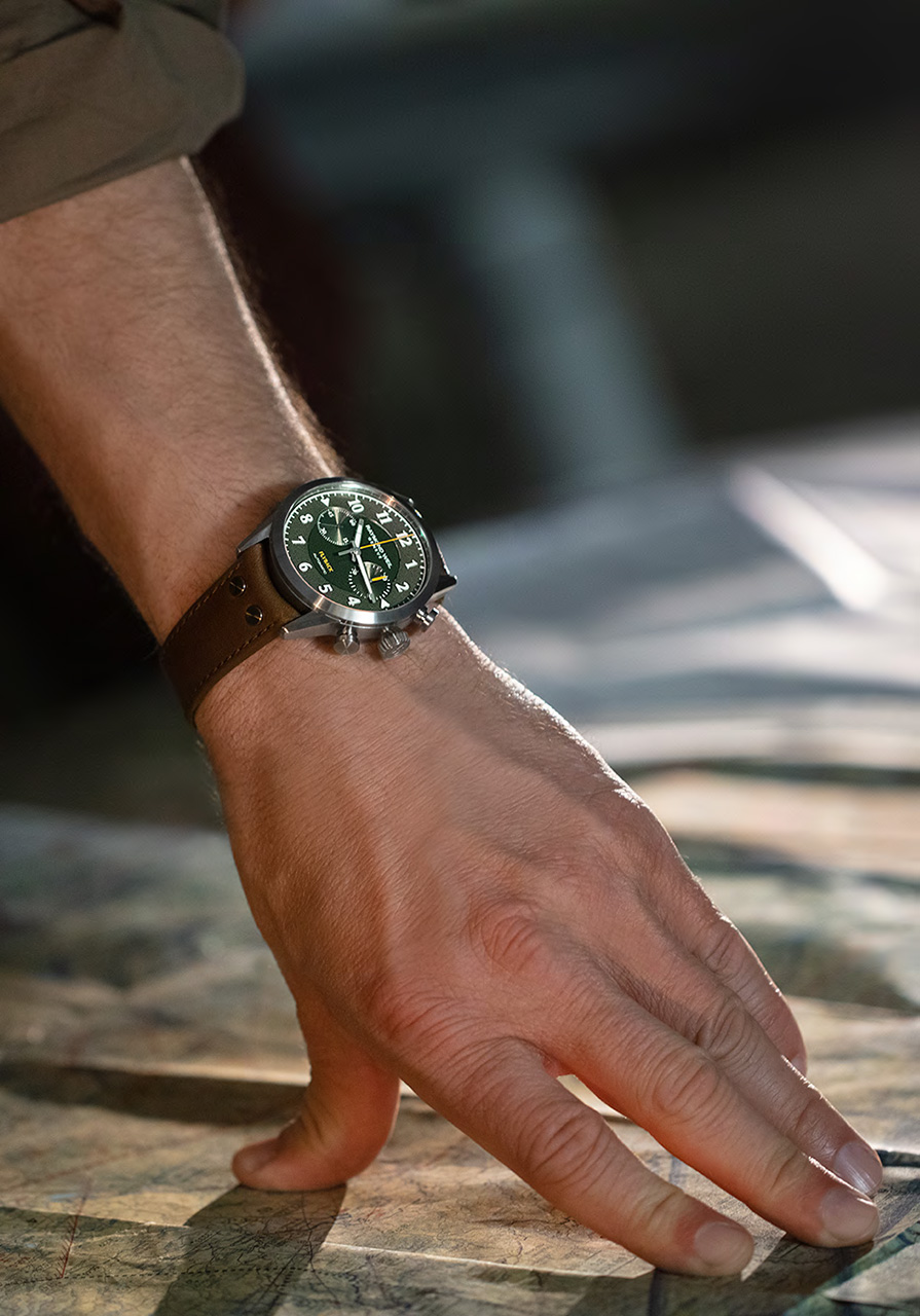 Часовая и минутная стрелки в минималистичном стиле в форме Baton расположены над циферблатом темно-зеленого цвета с накладными арабскими цифрами. Индексы в форме стрел в положениях «3» и «9 часов» отдают дань уважения пилотским часам прошлого, а часовая стрелка с богатой фактурой напоминает асфальт. Стрелки и часовые индексы оснащены люминесцентным покрытием Super-LumiNova®, которое улучшает считываемость показаний в условиях недостаточной освещенности. Центральная секундная стрелка хронографа выполнена в ярко-желтом цвете, который повторяется на 30-минутном регистре хронографа. Дизайн с двумя счетчиками обеспечивает симметричную и гармоничную компоновку, а циферблат окружен четкой белой дорожкой, облегчающей считывание показаний.
