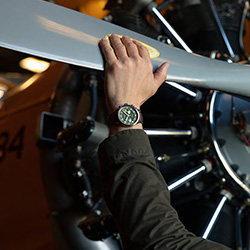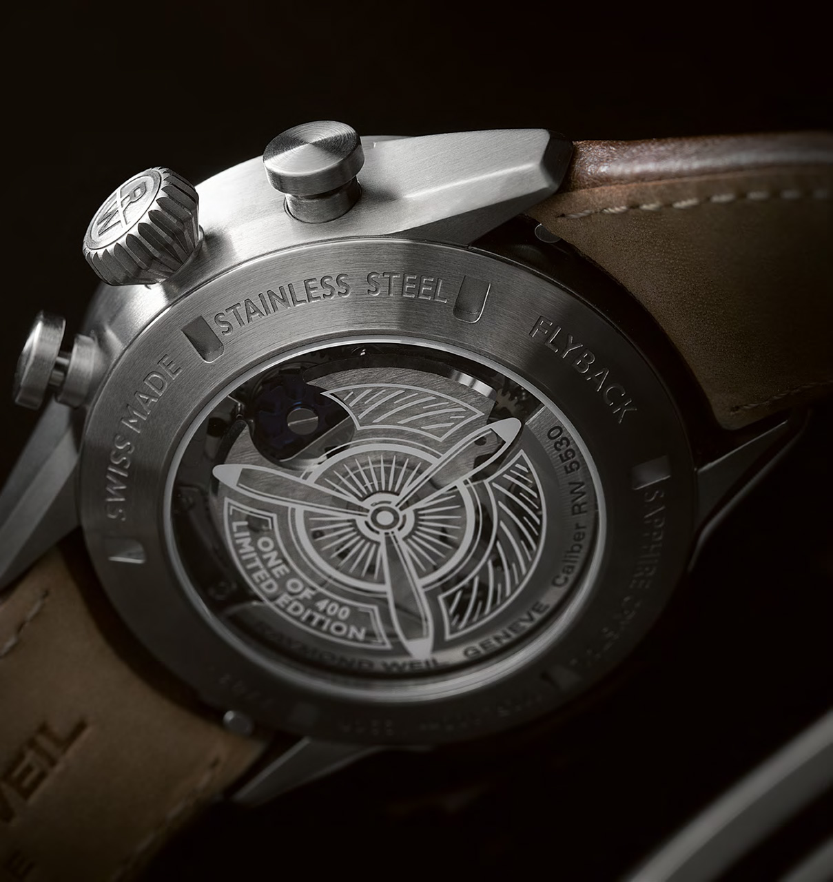 В корпусе диаметром 42 мм стальная поверхность покрыта серым PVD-покрытием, что придает часам элегантный и авантюрный вид. Эта винтажная авиационная тема распространяется и на заводную головку луковичной формы, которая является стандартом дизайна часов для пилотов, и на коричневый кожаный ремешок с заклепками, напоминающими заклепки на самолетах. Часы выпущены ограниченной серией в количестве всего 400 экземпляров. Их эксклюзивность подчеркивает характерный мотив пропеллера, выгравированный на задней крышке из сапфирового стекла.