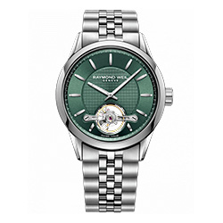 Центральное место в этих часах занимает видимое балансировочное колесо, расположенное над положением «6 часов». Дизайн с открытой диафрагмой подчеркивает индивидуальный механический механизм RAYMOND WEIL с автоматическим заводом.