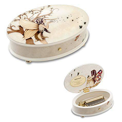 Эта овальная музыкальная шкатулка выполнена из земляничного дерева, окрашенного в белый цвет. Она украшена тонкой инкрустацией из перламутра, древесины и латуни. На крышке изображена изящная фея среди завораживающих узоров. Внутри спрятан механизм, исполняющий три мелодии, каждая из которых звучит словно сказка.