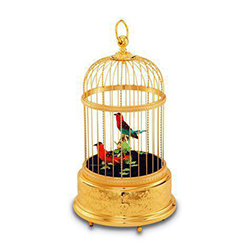 Эта шкатулка в форме золотой клетки — восхитительный экземпляр сочетания механики и поэзии. Две певчих механических птички поют и двигаются с поразительной реалистичностью: они поворачивают головы, щёлкают клювами, поднимают хвост. Более того, их перьевой покров выполнен из настоящих перьев. Пение воспроизводится в двух режимах — прерывисто (в течение 14 минут) или без перерыва (2 минуты). Внутри — 250 деталей, собранных вручную.