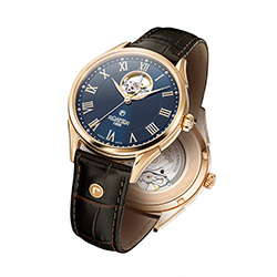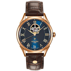 7. Roamer Swiss Matic Swinging Heart 550661-49-42-05 Корпус из нержавеющей стали с PVD-покрытием из розового золота. Синий циферблат с центральными стрелками и накладными римскими цифрами с розовой позолотой, с усложнением «Swinging Heart». Коричневый ремешок из натуральной кожи с застёжкой-бабочкой из нержавеющей стали с розовой позолотой. |