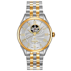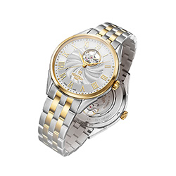 5. Roamer Swiss Matic Swinging Heart 550661-47-22-50 Корпус из нержавеющей стали с PVD-покрытием из жёлтого золота. Серебристый циферблат с декором «Sunray», центральными стрелками и накладными римскими цифрами с жёлтой позолотой, с усложнением «Swinging Heart». 5-рядный браслет из нержавеющей стали с чередованием звеньев с матовой и жёлто-золотой отделкой, с застёжкой-бабочкой из нержавеющей стали. |