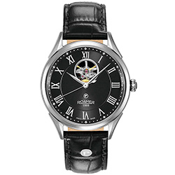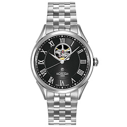3. Roamer Swiss Matic Swinging Heart 550661-41-52-05 Корпус из нержавеющей стали с матовой отделкой. Чёрный циферблат с центральными серебристыми стрелками, накладными серебристыми римскими цифрами и усложнением «Swinging Heart». Чёрный ремешок из натуральной кожи с застёжкой-бабочкой из нержавеющей стали. |