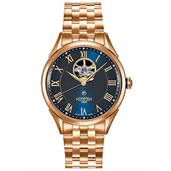 8. Roamer Swiss Matic Swinging Heart 550661-49-42-50 Корпус из нержавеющей стали с PVD-покрытием из розового золота. Синий циферблат с центральными стрелками и накладными римскими цифрами с розовой позолотой, с усложнением «Swinging Heart». 5-рядный браслет с застёжкой-бабочкой из нержавеющей стали с PVD-покрытием из розового золота. |