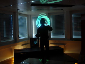 Во-вторых, доску можно использовать и для "примерки" новинок. Вот как это происходит. На руке у техника обычная "бумажная" модель. Вы надеваете ее на руку, подносите к экрану, выбирается модель - любую! - и нажимается на клавишу. В итоге модель полностью, включая объем, проецируется на экране: вы видите себя как в зеркале - с новой моделью часов, вы можете оценить, как эта модель выглядит со стороны и подходит ли она вам. Отличный способ выбрать подходящую модель из тех, которых еще нет в городе и проверить, как одна и та же модель будет смотреться на разных запястьях.