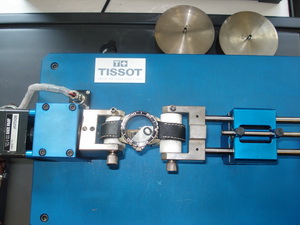 Ремешки проверяют еще и на износ трением: вот аппарат, на котором лежит ремешок и подвижная часть его трет. Если ремешок кожаный, то его дополнительно еще и поливают водой - если на коже появляются трещины или она теряет цвет, то Tissot выбраковывает всю партию! Следующий прибор работает только ночью, потому что на нем проверяют противоударные часы: часы складывают в железную коробку и взбалтывают 10 000 раз (очень шумно!).