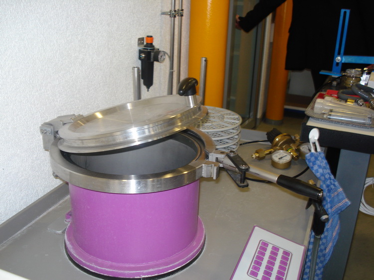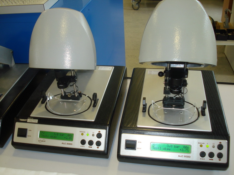 После музея нам показали все этапы внутреннего контроля качества часов Tissot. Проверяют ВСЕ партии часов: из каждой партии берут определенную долю - для существующей линейки это 10% партии, для новых моделей - первые 50 часов. Первый прибор - вот эта белая "колба" - это электронное тестирование корпуса.