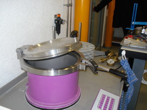 Есть и специальный прибор, который проверяет "противодную устойчивость": в этой смешной "кастрюльке" часы должны выдержать давление в 50 бар плюс дополнительно проверку водой!