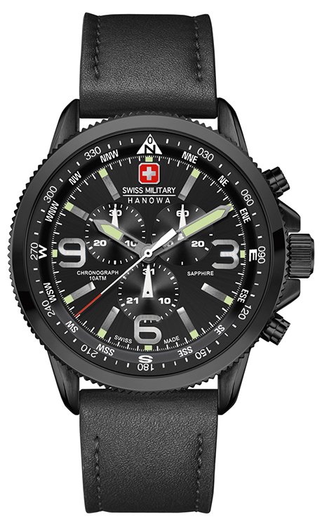 - Swiss Military Hanowa Arrow Chrono 06-4224.13.007: корпус с ионным напылением чёрного цвета, чёрный циферблат и чёрный ремешок.