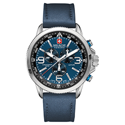 - Swiss Military Hanowa Arrow Chrono 06-4224.04.003: серебристый корпус, синий циферблат, ремешок синего цвета.