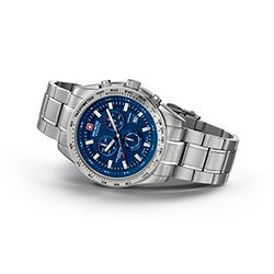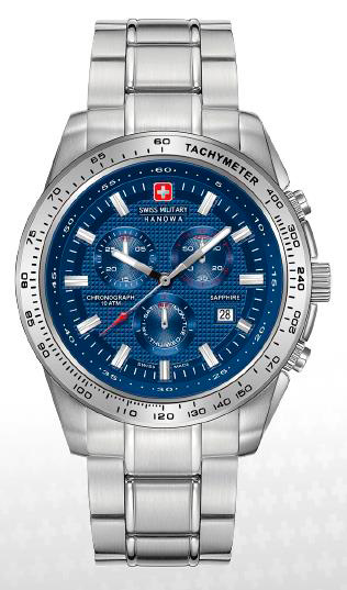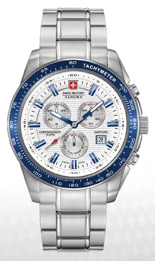 6. Swiss Military Hanowa Crusader Chrono 6-5225.04.001.03: корпус из нержавеющей стали 316L, безель с ионным покрытием синего цвета и тахиметрической шкалой, белый циферблат с часовыми индексами синего цвета, браслет из нержавеющей стали. | |