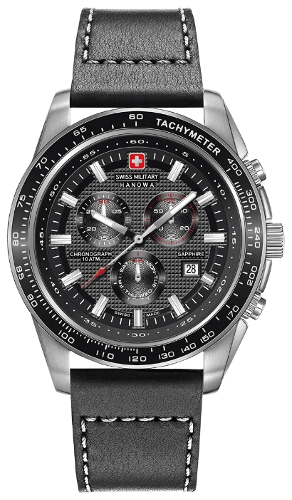 4. Swiss Military Hanowa Crusader Chrono 6-4225.04.007: корпус из нержавеющей стали 316L, безель с ионным покрытием чёрного цвета и тахиметрической шкалой, чёрно-серый циферблат с часовыми индексами серого цвета, серый кожаный ремешок с белой прострочкой. | |