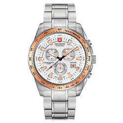 7. Swiss Military Hanowa Crusader Chrono 6-5225.04.001.09: корпус из нержавеющей стали 316L, безель с ионным покрытием розовой позолотой и тахиметрической шкалой, белый циферблат с часовыми индексами цвета розового золота, браслет из нержавеющей стали. | |