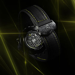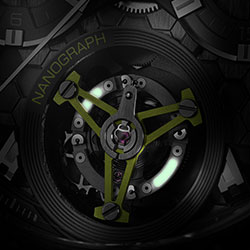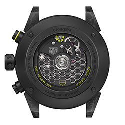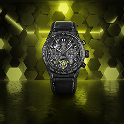 Наноскопическая (в миллион раз меньше одного миллиметра) гексагональная кристаллическая решетка карбонового композита, из которого изготовлена балансовая спираль, находит свое отражение в дизайне модели Carrera Calibre Heuer 02T Tourbillon Nanograph. Еще одной особенностью этого хронографа является многоуровневое оформление циферблата и калибра. Сквозь открытый циферблат можно наслаждаться видом на пластину механизма, украшенную шестигранниками, поверхность которых обработана пескоструйным методом и затем тщательно отполирована. Характерный рисунок также нанесен на ротор с черным PVD-покрытием, за движением которого можно наблюдать сквозь прозрачную заднюю крышку из сапфирового стекла. Вдохновленные историческими моделями элементы новых часов – алюминиевый мост и гравировка на механизме с турбийоном – выполнены в ярком неоново-зеленом цвете. Балансовое колесо модели выполнено из алюминиевого сплава и привлекает внимание своими вставками из белого золота. Покрытие SuperLuminova® гарантирует владельцу часов удобство считываемости показаний – независимо от времени суток.