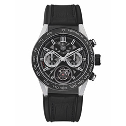 1. TAG Heuer Carrera Heuer-02T Tourbillon Titanium CAR5A8Y. FC6377: титановый корпус с чёрным покрытием из карбида титана, проушины – с матовой отделкой, чёрный керамический безель с серой тахиметрической шкалой; чёрный циферблат с условными часовыми индексами, стрелками и счётчиками хронографа из титана с матовой отделкой, с красной надписью «COSC» между отметками «8 и 9 часов»; чёрный кожаный ремешок, титановая раскладывающаяся застёжка с чёрным покрытием из карбида титана, предохранительными кнопками и символом марки «TAG Heuer». | |
