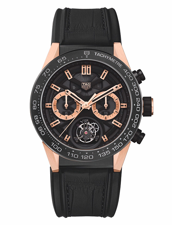 3. TAG Heuer Carrera Heuer-02Т Tourbillon Titanium and Rose Gold/ Ceramic Bezel CAR5A5Y. FC6377: титановый корпус с чёрным покрытием из карбида титана, кроме проушин для ремешка из 18 каратного розового золота, чёрный керамический безель с серой тахиметрической шкалой; чёрный циферблат с условными часовыми индексами, стрелками и счётчиками хронографа из титана с гальваническим покрытием из 18-каратного розового золота, с тёмно-серой надписью «COSC» между отметками «8 и 9 часов»; чёрный кожаный ремешок, титановая раскладывающаяся застёжка с чёрным покрытием из карбида титана, предохранительными кнопками и символом марки «TAG Heuer». | |