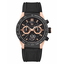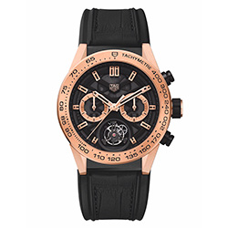 4. TAG Heuer Carrera Heuer-02Т Tourbillon Titanium and Rose Gold/ Gold Bezel CAR5A5Z. FC6377: титановый корпус с чёрным покрытием из карбида титана, кроме проушин для ремешка из 18 каратного розового золота, безель из розового золота (18 карат) с чёрной тахиметрической шкалой; чёрный циферблат с условными часовыми индексами, стрелками и счётчиками хронографа из титана с гальваническим покрытием из 18-каратного розового золота, с тёмно-серой надписью «COSC» между отметками «8 и 9 часов»; чёрный кожаный ремешок, титановая раскладывающаяся застёжка с чёрным покрытием из карбида титана, предохранительными кнопками и символом марки «TAG Heuer». |