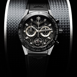 2. TAG Heuer Carrera Heuer-02T Tourbillon «Black Phantom» Limited edition CAR5A8Z. FC6377: модель «all black» ограниченной серии в количестве 250 индивидуально пронумерованных экземпляров: титановый корпус с чёрным покрытием из карбида титана всех его металлических элементов, чёрный керамический безель с серой тахиметрической шкалой; чёрный циферблат с условными часовыми индексами, стрелками и счётчиками хронографа из титана чёрного цвета, с серой надписью «COSC» между отметками «8 и 9 часов»; чёрный кожаный ремешок, титановая раскладывающаяся застёжка с чёрным покрытием из карбида титана, предохранительными кнопками и символом марки «TAG Heuer». | |