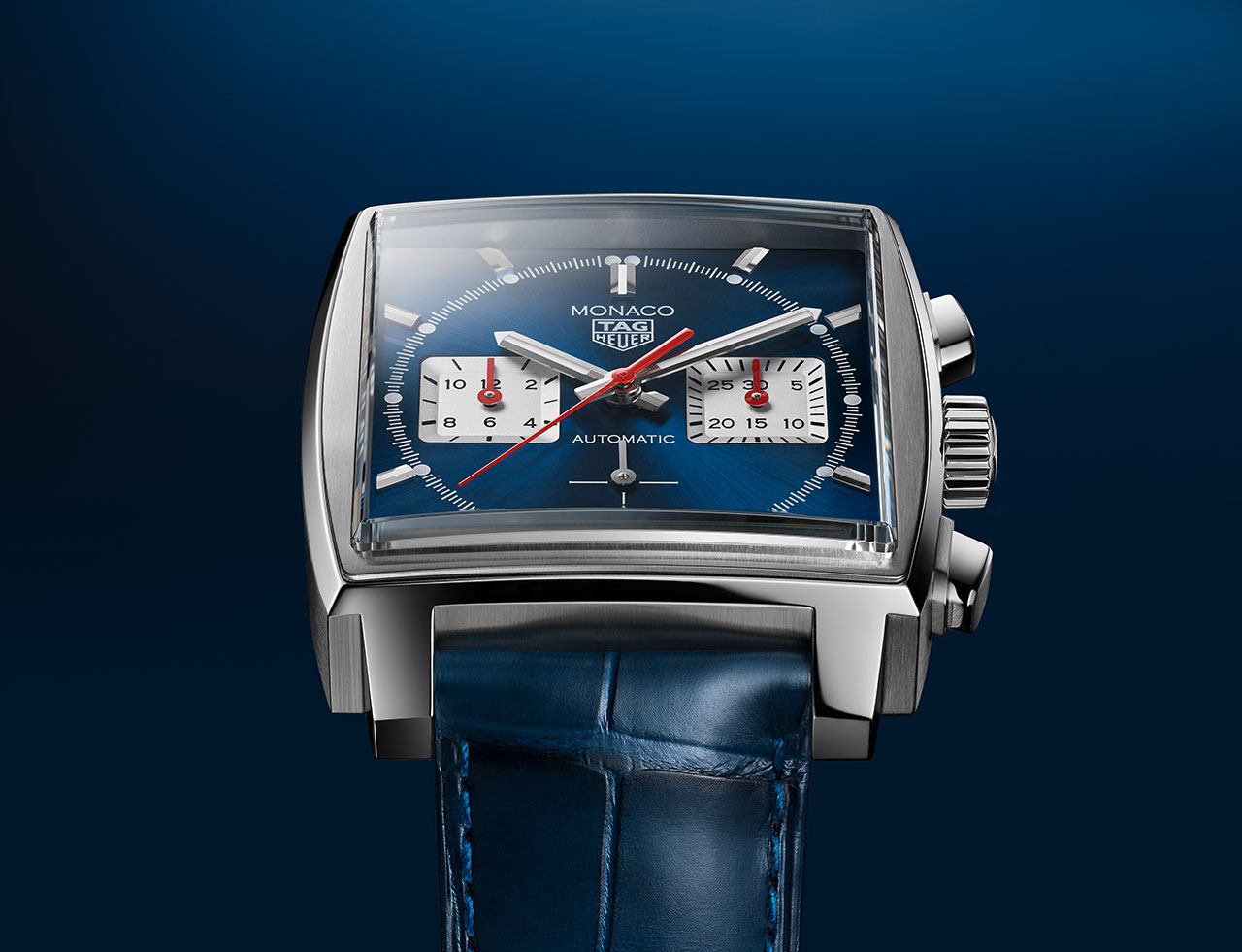 Часы Monaco Heuer 02 из нержавеющей стали представлены с синим PVD циферблатом с эффектом sunray, на темно-синем ремешке из кожи аллигатора с темно-синей прострочкой. Циферблат оснащен обновленными счетчиками из серебра и опала в позициях 3 и 9 часов, а также восемью трехгранными индексами и новым постоянным вторым индикатором над датой в позиции 6 часов. Красные акценты на центральной секундной стрелке и стрелки хронографа подчеркивают спортивный дизайн часов. Точный калибр механизма Heuer 02 обладает впечатляющим запасом хода – 80 часов. Интегрировав этот механизм в Monaco, TAG Heuer объединил один из своих самых знаковых продуктов с передовыми достижениями в часовом деле.