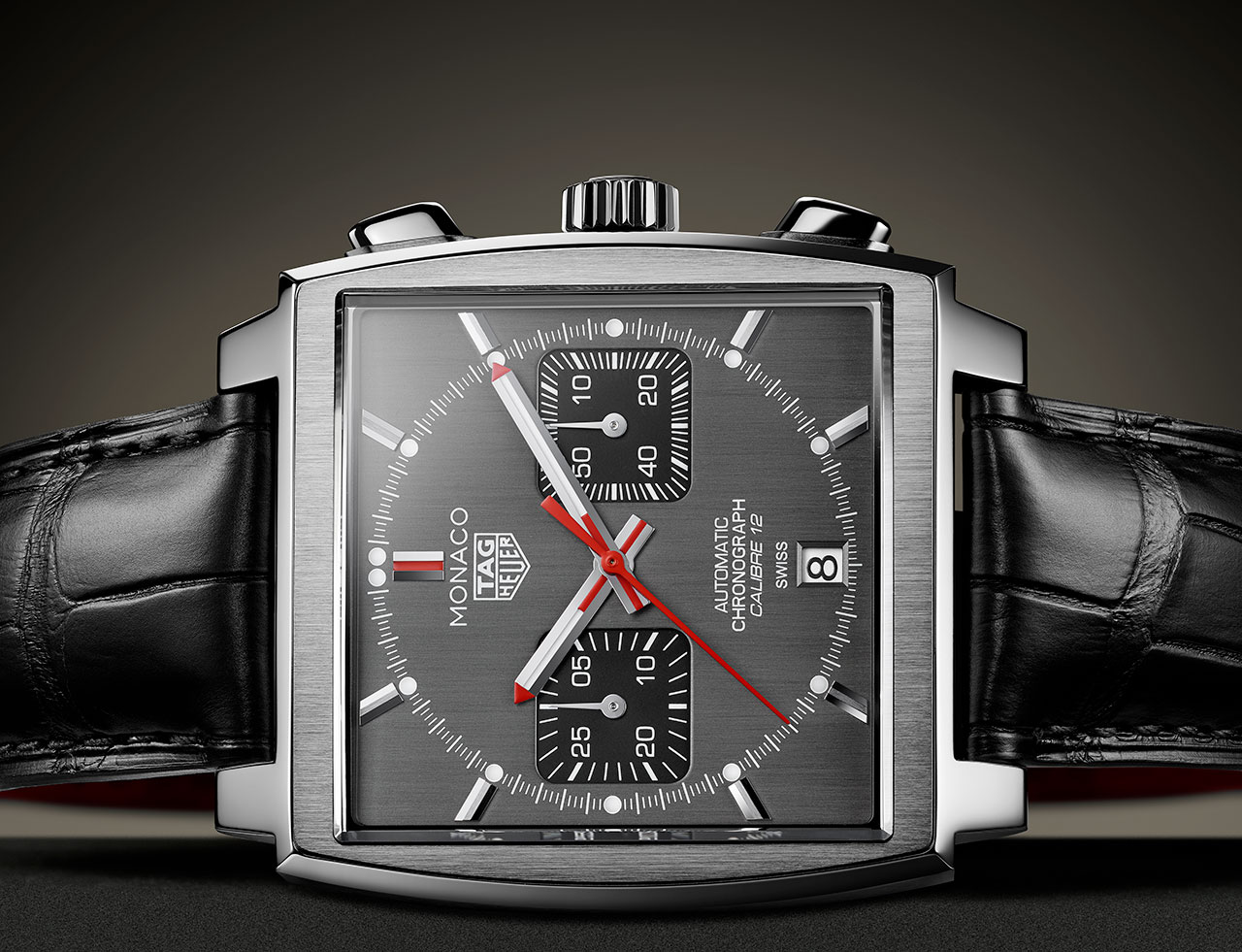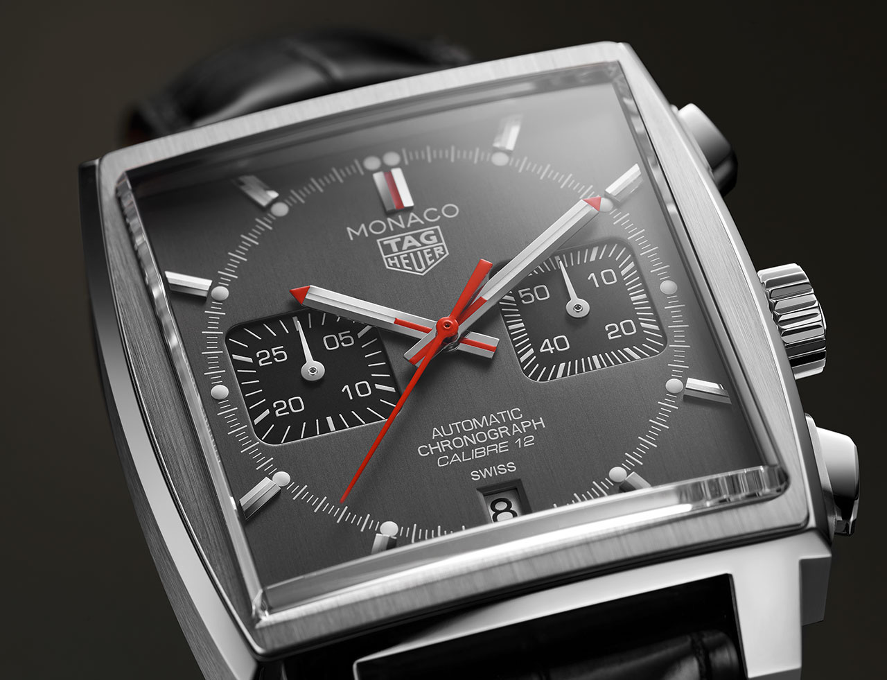 В отличие от изначального механизма Monaco Calibre 11 новый Calibre 12 обновил внешний вид знаменных часов. Теперь заводная головка расположена с правой стороны корпуса – вместо левой, как это было с Calibre 11. TAG Heuer представляет последнюю модель Calibre 12 Monaco с потрясающим серым циферблатом. Модель из нержавеющей стали оснащена классическим черным ремешком из кожи аллигатора с матовым рутениевым циферблатом. Рутений является частью платиновой группы и переливается разными оттенками в зависимости от источника света. Гладкие черные опаловые счетчики в позициях 3 и 9 часов создают изысканный контраст с матовым циферблатом. Центральная секундная стрелка, 12-часовой указатель и кончики часовой и минутной стрелок ярко-красного оттенка подчеркивают современный стиль этой легендарной модели. Всего выпущено 1000 экземпляров Monaco Calibre 12 Final Edition, а на корпусе из нержавеющей стали каждой модели выгравирован ее лимитированный номер. (6,7)
