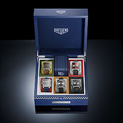 Как и сами часы, коробка для них выполнена в стиле оригинала. Каждая из моделей специального выпуска поставляется в коробке той же цветовой гаммы, что и часы – в тон десятилетию, которое они представляют. Модель в стиле 2010-х годов упакована в темно-синюю коробку, украшенную логотипом Heuer и полоской, стилизованной под клетчатый гоночный флаг. Часы расположены на серой подушке, внутренняя отделка выполнена в черном цвете.