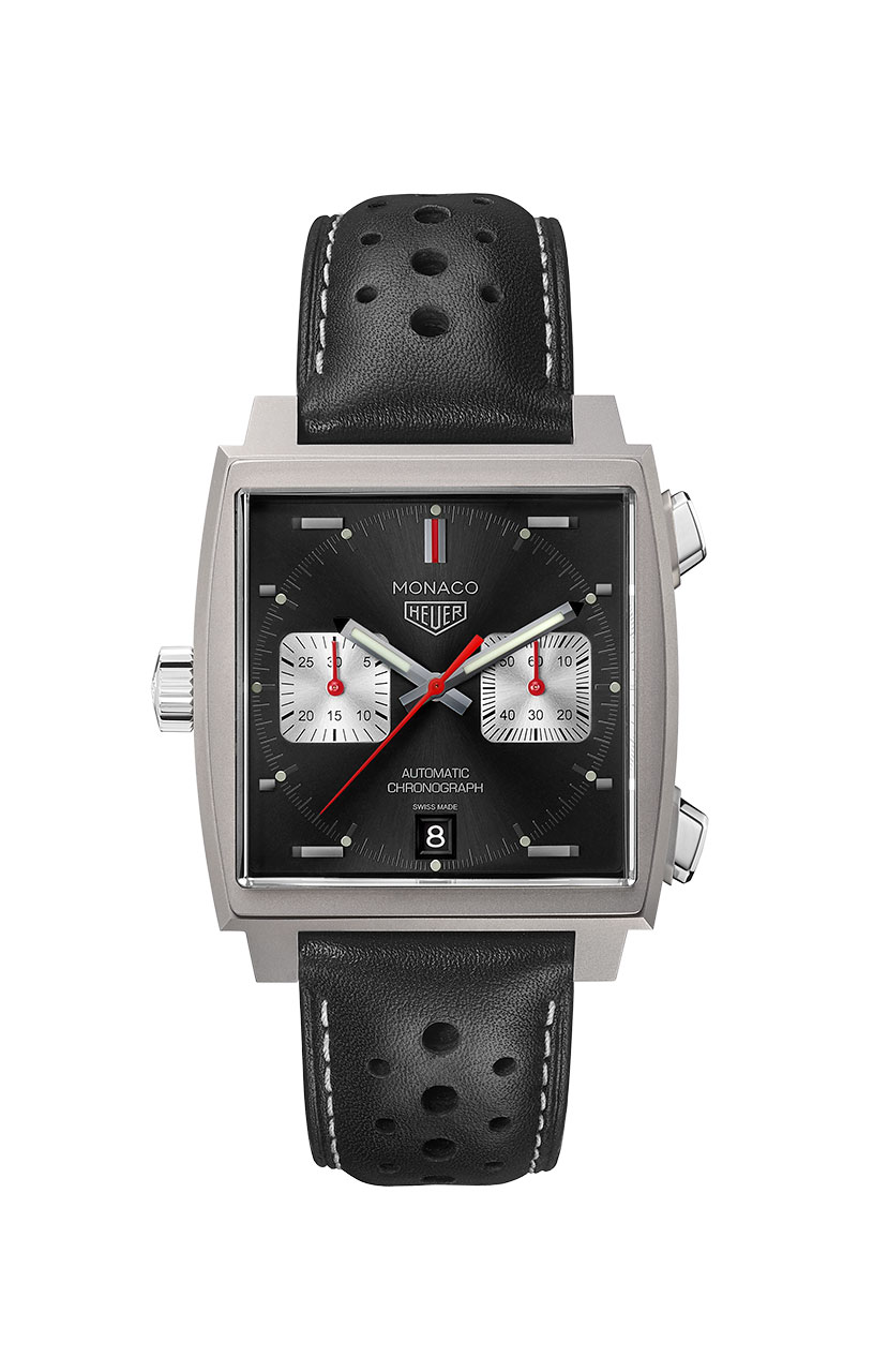Отражая стиль и дух последнего десятилетия, вошедшего в полувековую историю культовой модели TAG Heuer Monaco, часы пятой юбилейной серии привлекают своей прямолинейностью и простотой форм. Оригинальный корпус, на котором выделяются блестящие полированные кнопки, выполнен из нержавеющей стали c пескоструйной обработкой. Часы представлены в комплекте с черным ремешком из перфорированной телячьей кожи с внутренним покрытием черного цвета и серой прострочкой. Темно-серый циферблат с эффектом sunray украшен индексами с покрытием из черного золота и люминесцентным покрытием SuperLuminova®. На поверхности дополнительных циферблатов с родиевым покрытием также хорошо различим эффект sunray. Яркими элементами, придающими динамизм новой модели, служат стрелки дополнительных счетчиков, центральная секундная стрелка и метка в положении «12 часов», которые выполнены в ярко-красном цвете. Часовая и минутная стрелки покрыты черным золотом и имеют тонкую люминесцентную полоску из SuperLuminova®. Благодаря ей показания времени отлично считываются в любых условиях.
