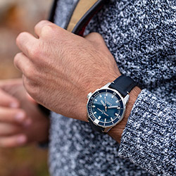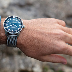Модель из лимитированной коллекции Diver Blue Shark Limited Edition (выпущена в количестве 300 экземпляров) выполнена из нержавеющей стали с PVD-покрытием. Синий циферблат гармонирует с цветом безеля. Ремешок декорирован ярко-оранжевой строчкой. На задней крышке нанесена гравировка синей акулы – по аналогии с белой акулой, изображенной на модели Diver Great White диаметром 44мм.