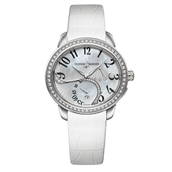 3. Ulysse Nardin Jade Jewellery Steel 3103-125B/591: корпус из нержавеющей стали, безель, украшенный бриллиантами круглой огранки общим весом 0,844 карата; белый перламутровый циферблат с инкрустацией из бриллиантов общим весом 0,332 карата; белый ремешок из кожи аллигатора с раскладывающейся застёжкой из нержавеющей стали. | |