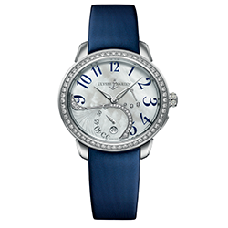 4. Ulysse Nardin Jade Jewellery Steel 3103-125B/591.3: корпус из нержавеющей стали, безель, украшенный бриллиантами круглой огранки общим весом 0,844 карата; белый перламутровый циферблат с инкрустацией из бриллиантов общим весом 0,332 карата; синий атласный ремешок с раскладывающейся застёжкой из нержавеющей стали. |