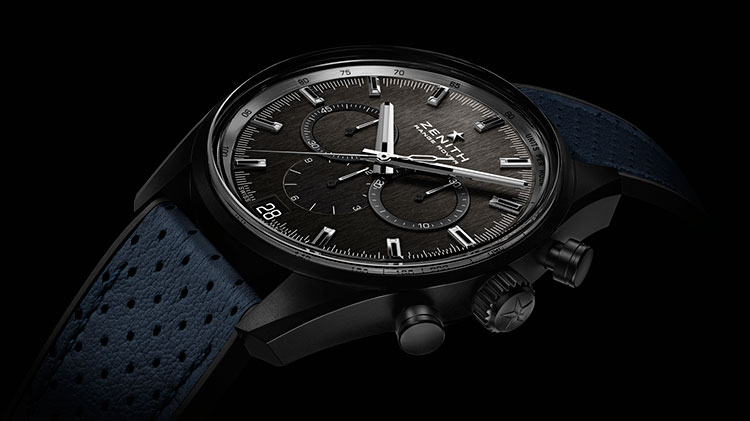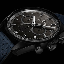 2. Zenith El Primero Range Rover Special Edition 24.2040.400/27.R796 Корпус из алюминиевого сплава с чёрным матовым покрытием из оксидной керамики. Матовый тёмно-серый циферблат с вертикальным сатинированием, центральными стрелками часов и минут и накладными условными часовыми индексами со скошенными гранями, родиевым напылением и люминесцентным покрытием белого цвета. Центральный 60-секундный, 30-минутный и 12-часовой счётчики хронографа; малая секундная стрелка и окошко даты. Чёрный каучуковый ремешок с декоративным покрытием из перфорированной телячьей кожи синего цвета и с тройной раскладывающейся титановой застёжкой с чёрным DLC-покрытием. |